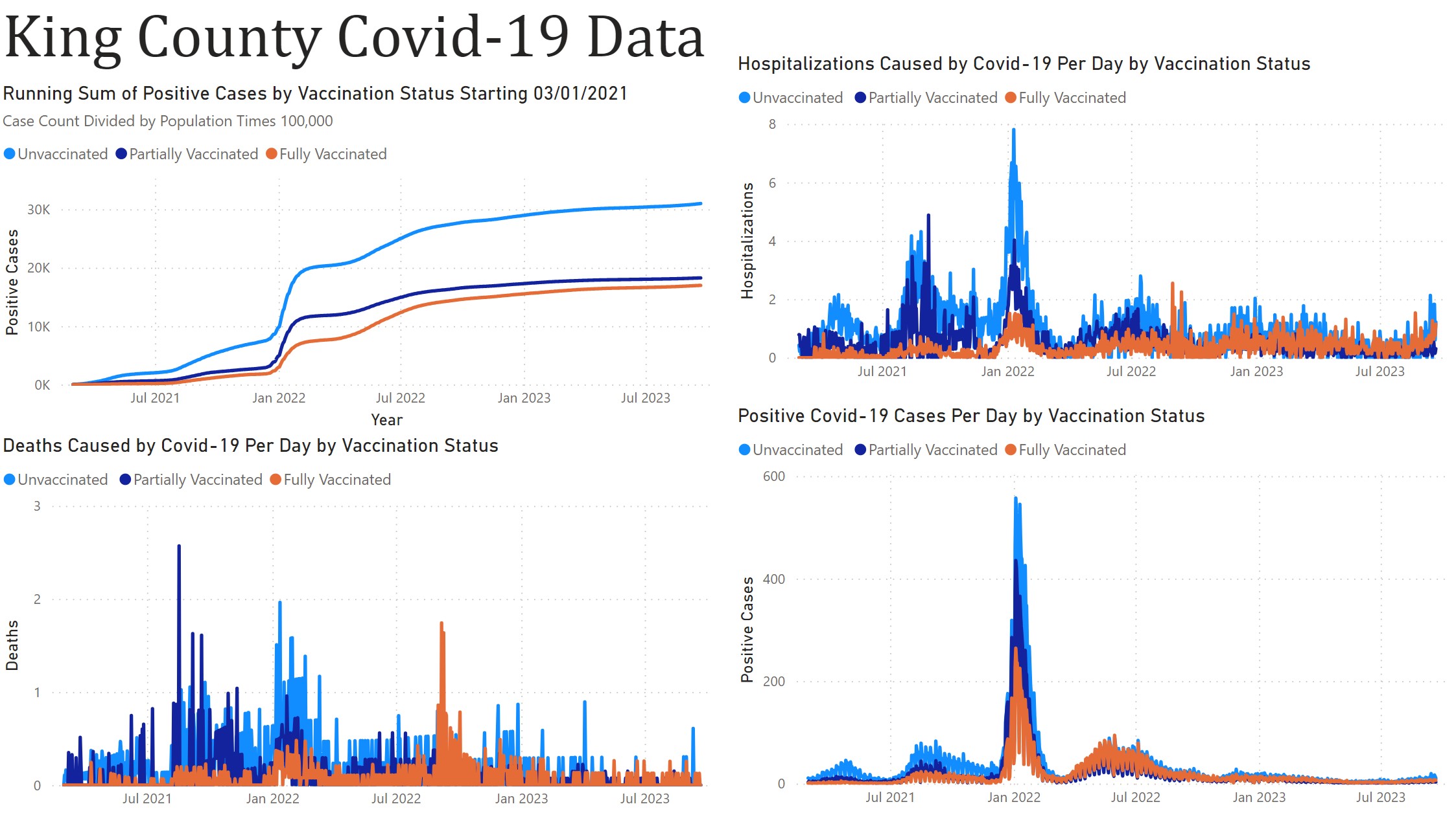 Shows the number of Covid-19 cases, hospitalizations, and deaths in King County, Washington by vaccination status over time. Also shows the sum of positive cases divided by the population of each group with a particular vaccination status over time.