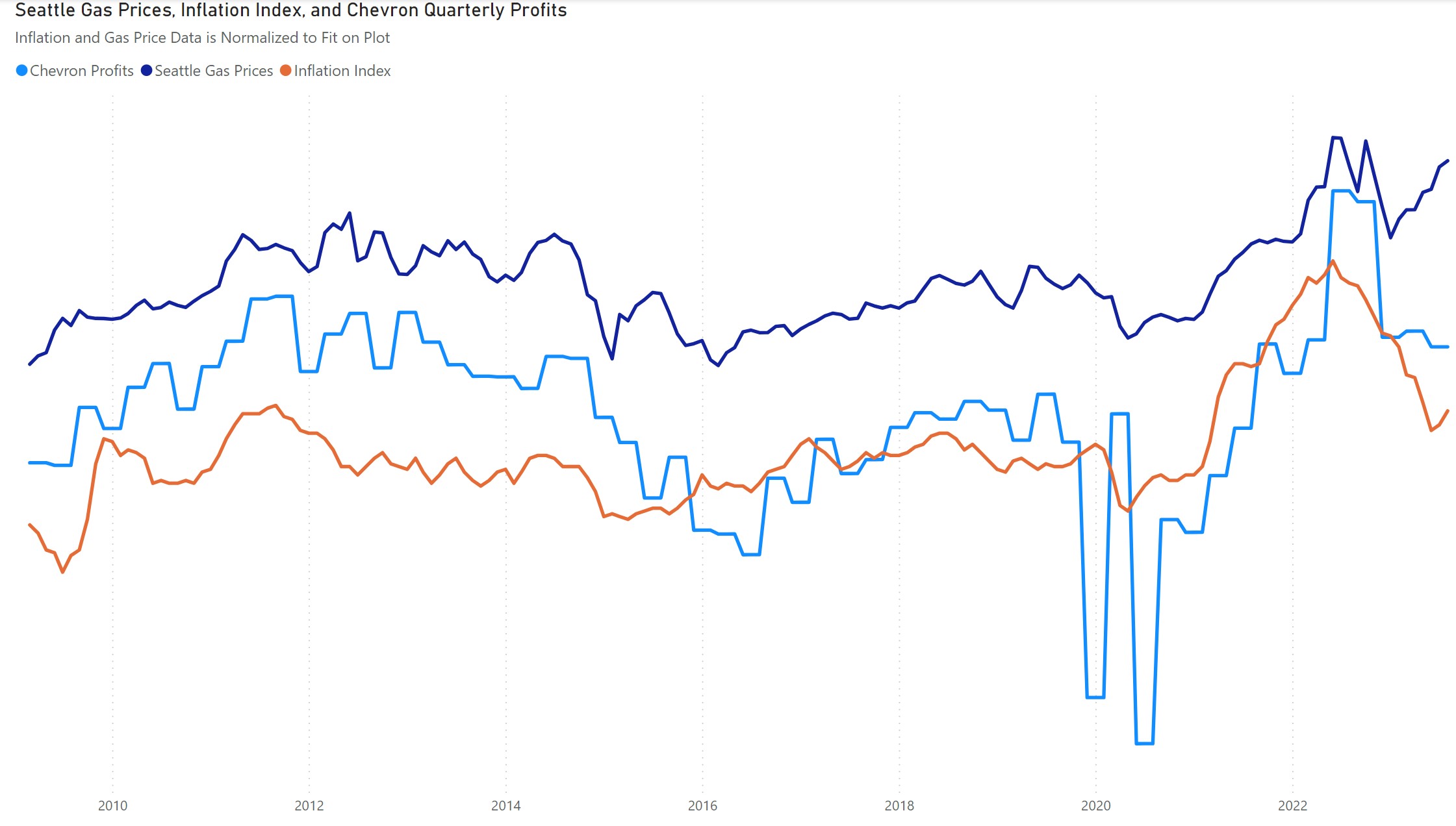 Shows gas prices plotted vs. inflation and vs. the profits of prominent gas and oil companies.Examines gas prices in Seattle and shows how the rise and fall of prices correlated with the inflation index and with how much profit the gas and oil companies were making.