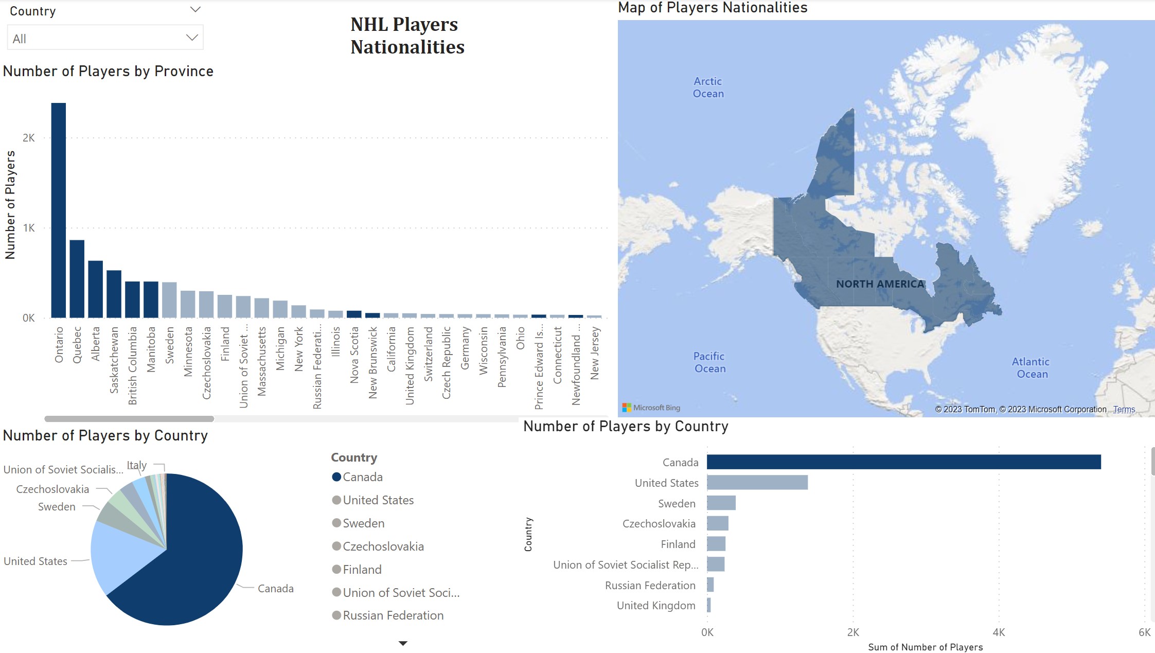 Shows where NHL hockey players are from, broken down by provinces and states for Canada and the US. I could not find a good visualization of that data, so I took data from hockey-reference.com and built one myself.