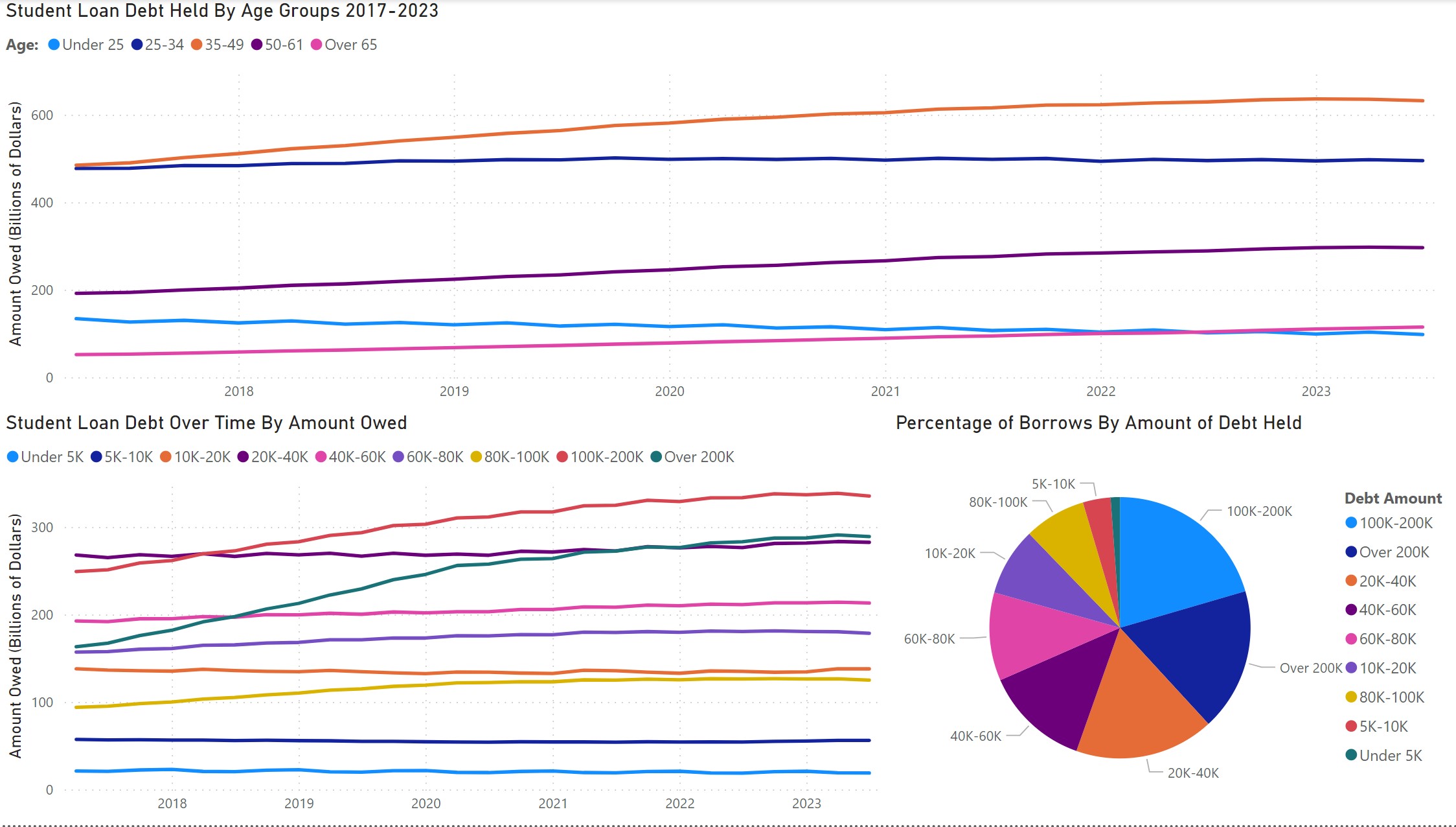 Shows the amount of student loan debt in the US over time. One graph shows the amount held by different age groups over time, one shows the amount of debt held by groups with certain amounts of debt over time, one shows the amount of debt held in each state, and the last one shows how much debt is owed grouped by the amount of debt of borrowers.